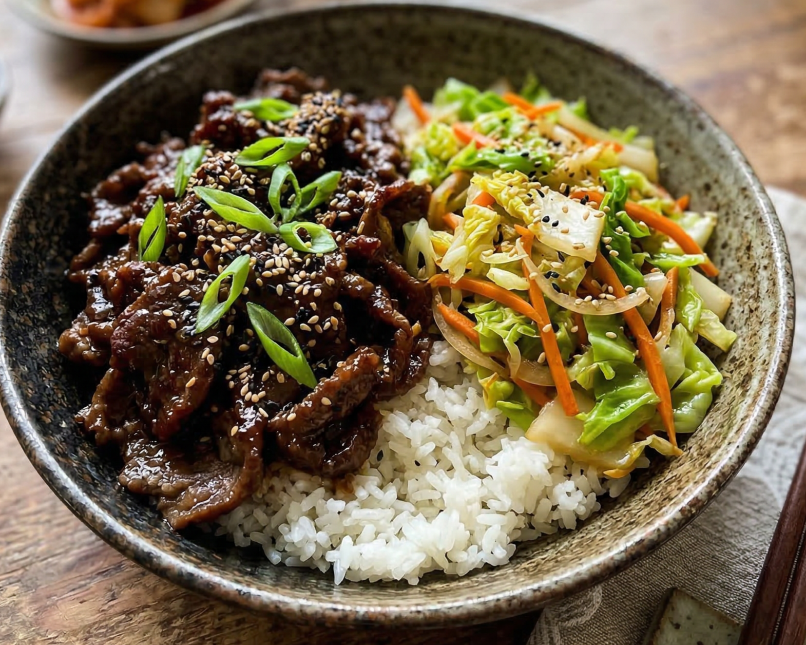 Bulgogi beef / Sautéed cabbage / Jasmine rice Contains: Soy, Sesame, Gluten (wheat-based soy sauce).